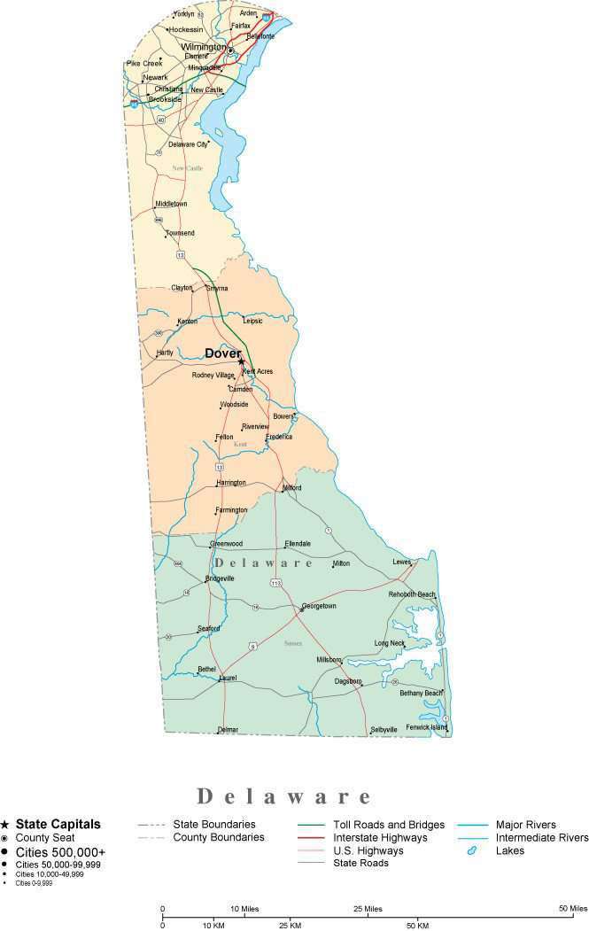 Multi Color Delaware Map with Counties, Capitals, and Major Cities